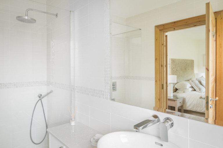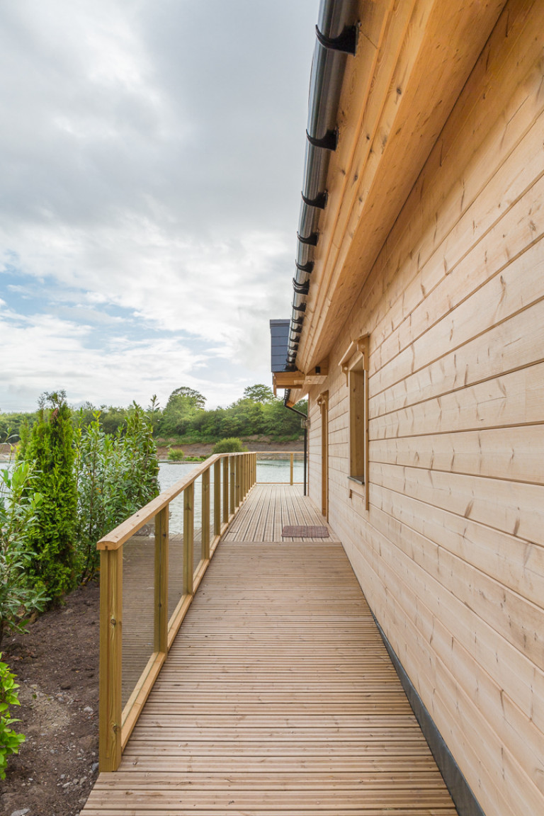 Weiße Wände, beeindruckende Fenster mit Holzrahmen und eine Kieferntreppe mit Glasgeländern. Dieses Design ist ein großartiges Beispiel für ein modernes Holzhaus.